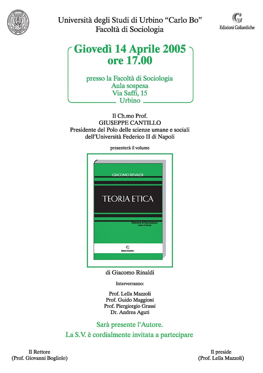 nella Sala Lauree della Facoltà di Sociologia, Piano B, Via Saffi, 15, Urbino KLAUS VIEWEG (Friedrich–Schiller–Universität di Jena) ha parlato sul tema: L’INIZIO DELLA FILOSOFIA: IL SUPERAMENTO HEGELIANO DEL PIRRONISMO Lunedì 18 aprile 2005 ore 10.00 e su: “IL LATO LIBERO DI OGNI FILOSOFIA”: SCEPSI E LIBERTÀ Martedì 19 aprile 2005 Il Ch.mo Prof. Giuseppe Cantillo ha presentato il volume: TEORIA ETICA di Giacomo Rinaldi Giovedì 14 aprile 2005 ore 17.00 |